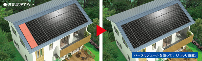 たとえば、切妻屋根にモジュールを並べてできた端の隙間にも、細長いモジュールを使うことでより多くのモジュールを設置することができ、発電量を増やすことができます。